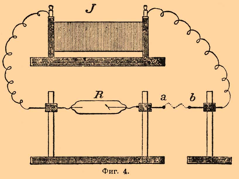 Р. лучи получаются не только тогда, когда сквозь Круксову трубку происходит разряд Румкорфовой катушки, но и в том случае, когда Круксова трубка соединяется с кондукторами большой электрической машины, например, с кондукторами многодисковой машины Фосса. При употреблении Румкорфовой катушки для возбуждения Р. лучей необходимо обращать внимание на правильность действия прерывателя тока в катушке. Чем быстрее прерывается ток в катушке, тем интенсивнее получаются Р. лучи. Для увеличения интенсивности лучей может служить введение в цепь Круксовой трубки разрыва, т. е. помещение между Круксовой трубкой и Румкорфовой катушкой двух шариков, между которыми должны проскакивать искры. Схема такого соединения показана на фиг. 4.