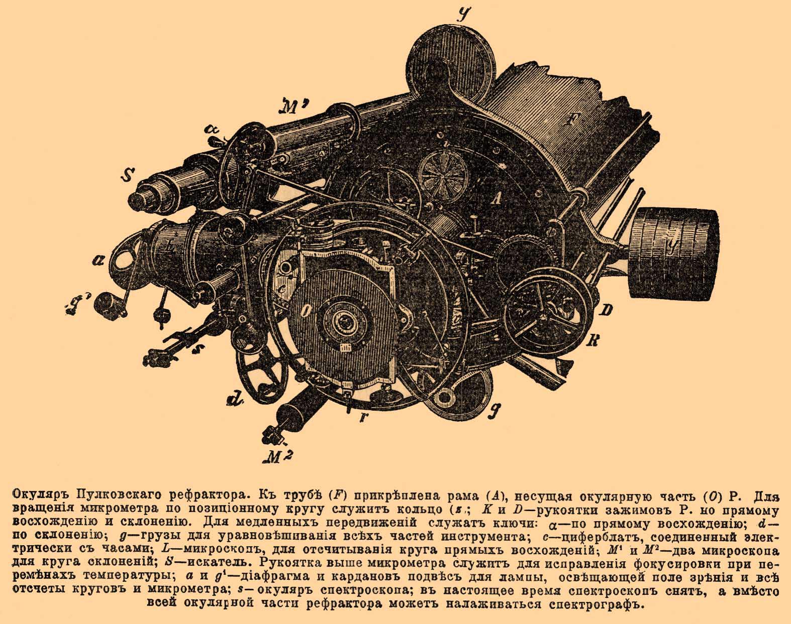 Окуляр Пулковского рефрактора. К трубе (F) прикреплена рама (A), несущая окулярную часть (O) Р. Для вращения микрометра по позиционному кругу служит кольцо (s); K и D — рукоятки зажимов Р. по прямому восхождению и склонению. Для медленных передвижений служат ключи: α — по прямому восхождению; d — по склонению; g — грузы для уравновешивания всех частей инструмента; c — циферблат, соединенный электрически с часами; L — микроскоп, для отсчитывания круга прямых восхождений; M1 и М 2 — два микроскопа для круга склонений; S — искатель. Рукоятка выше микрометра сложит для исправления фокусировки при переменах температуры; a и g1 — диафрагма и карданов подвес для лампы, освещающей поле зрения и все отсчеты кругов и микрометра; s — окуляр спектроскопа; в настоящее время спектроскоп снят, а вместо всей окулярной части рефрактора может налаживаться спектрограф.
