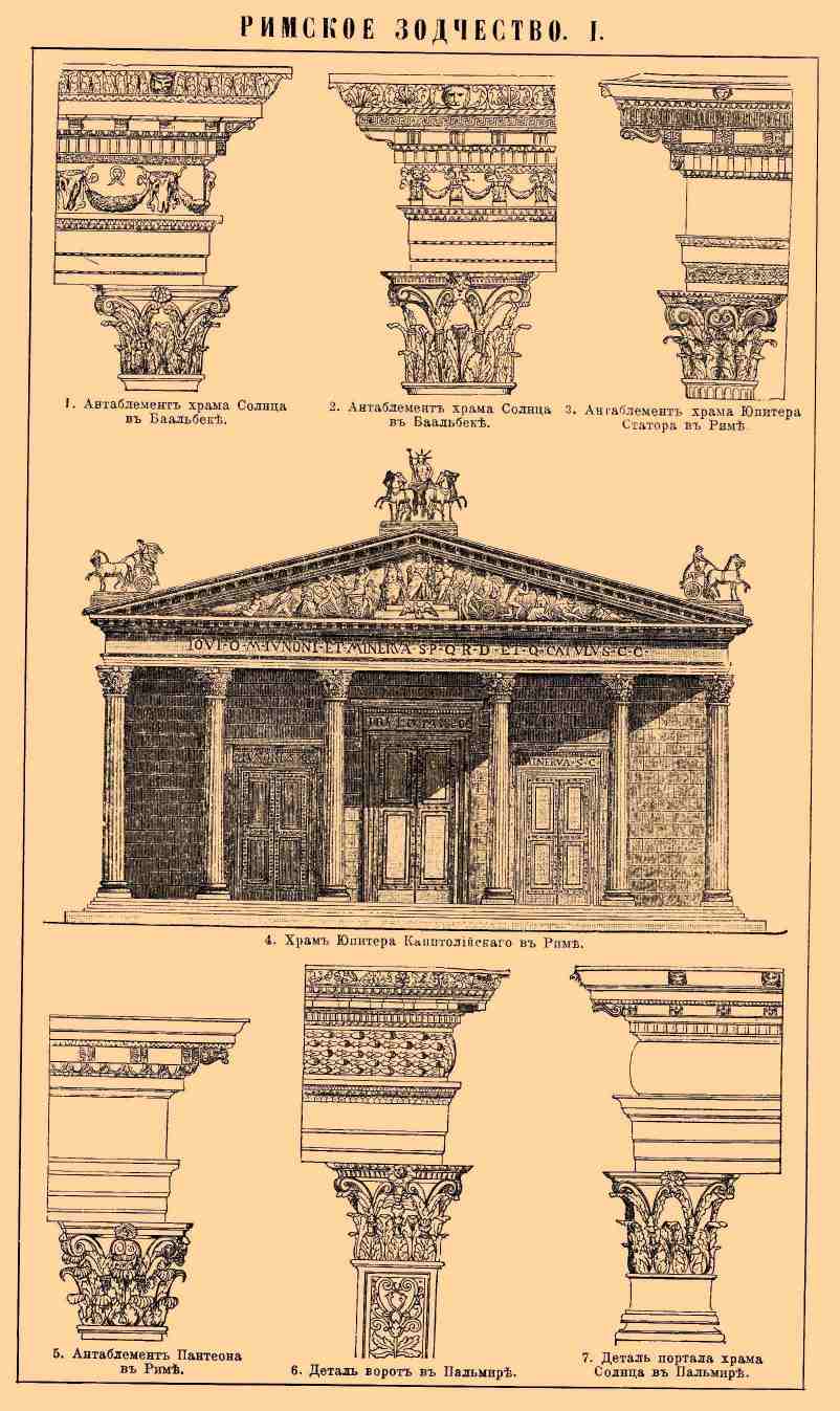 1. Антаблемент храма Солнца в Баальбеке. 2. Антаблемент храма Солнца в Баальбеке. 3. Антаблемент храма Юпитера Статора в Риме. 4. Храм Юпитера Капитолийского в Риме. 5. Антаблемент Пантеона в Риме. 6. Деталь ворот в Пальмире. 7. Деталь портала храма Солнца в Пальмире.
