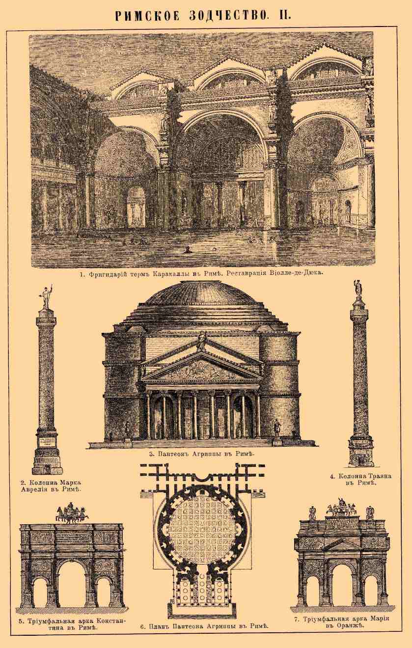 1. Фригидарий терм Каракаллы в Риме. Реставрация Виолле-де-Дюка. 2. Колонна Марка Аврелия в Риме. 3. Пантеон Агриппы в Риме. 4. Колонна в честь Траяна в Риме. 5. Триумфальная арка Константина в Риме. 6. План Пантеона Агриппы в Риме. 7. Триумфальная арка Мария в Оранже.