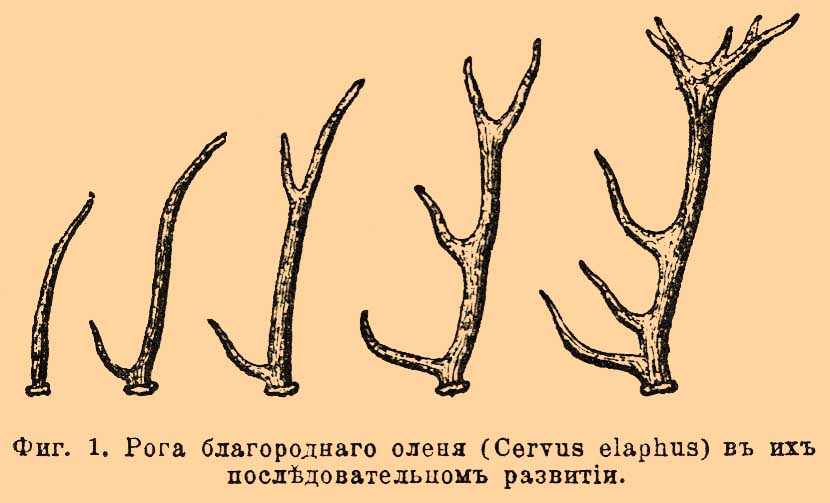 Фиг. 1. Рога благородного оленя (Cervus elaphus) в последовательном развитии.