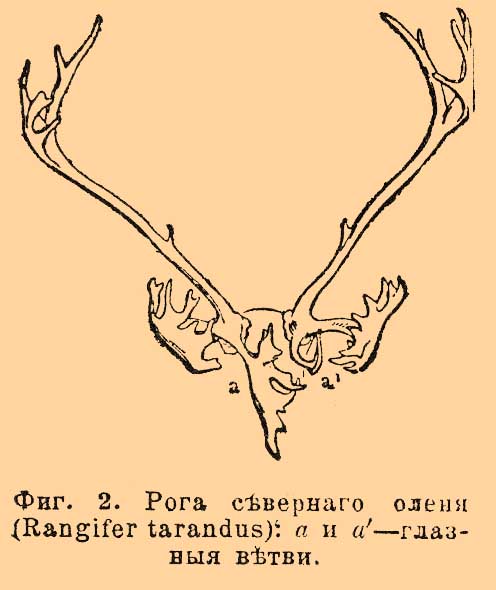 Фиг. 2. Рога северного оленя (Rangifer tarandus); a и a' — глазные ветви.