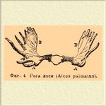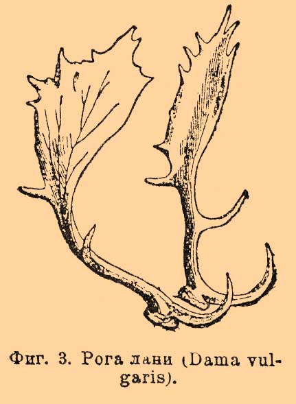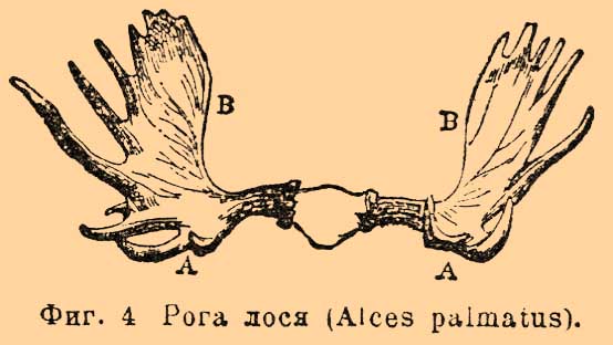 Иногда Р. так и остаются лишь с одной ветвью (индийский Cervulus или оленек), но чаще всего число ветвей увеличивается и Р. превращаются в громадные, достигающие иногда весом 2 пудов и более, придатки. Самая нижняя ветвь, направляющаяся вперед и как бы служащая защитой глазам, называется глазной, но иногда, как например у косули (Cervus capreolus), глазные ветви могут отсутствовать. Самая форма оленьих Р. весьма разнообразна, но можно отметить два главных типа: в одном случае, как например у благородного оленя (Cerv u s elaphus), марала (С. maral) и др., стволы и ветви Р. в разрезе круглые (фиг. 1); в другом случае Р. расширяются лопатообразно или только по верхушке, как например у северного оленя (фиг. 2), или большом протяжении, как у лани (Dama vulgaris, фиг. 3) или у лося (Alces palmatus, фиг. 4).