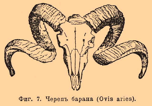 Р. семейства овец, куда относятся овцы и козы, загнутые назад и в стороны, при основании сжатые с боков или спереди назад, кольчатые, в разрезе угловатые, причем рога сжатые с боков, загнутые назад, с сильно развитыми кольчатыми возвышениями характерны для коз (Capra, фиг. 8), а сжатые спереди назад, загнутые спиралью назад и наружу, со слабыми кольчатыми возвышениями характерны для овец (Ovis, фиг. 7). У быков (семейство Bovidae) P. гладкие, по крайней мере у верхушки, и загнуты кнаружи. Роговой слой Р. этого типа идет на многочисленные роговые изделия.