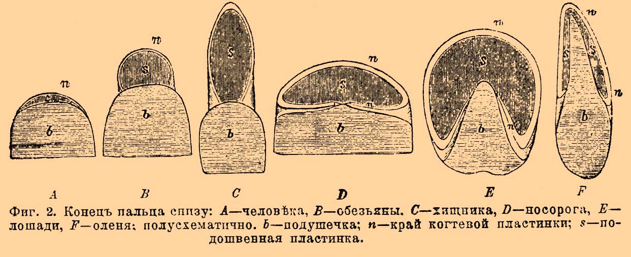 Фиг. 2. Конец пальца снизу: A — человека, B — обезьяны, C — хищника, D — носорога, E — лошади, F — оленя; полусхематично. b — подушечка; n — край когтевой пластинки; s — подошвенная пластинка.
