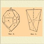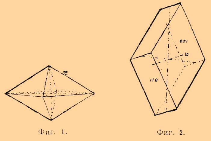 1) класс ромбической бипирамиды (иначе — голоэдрический или полногранный); характеризуется присутствием центра симметрии (c), трех осей симметрии 2-го порядка (3L2) и трех плоскостей симметрии (3Р). Представителем этого класса служит ромбическая бипирамида — форма, ограниченная восьмью неравносторонними треугольниками и представляющая две пирамиды, сложенные своими ромбическими основаниями (фиг. 1). Общее обозначение этой формы [hkl]. В зависимости от численного значения индексов может быть множество ромбических бипирамид. К этому же классу принадлежат три четырехгранные призматические формы, называемые призмами 1-го, 2-го и 3-го рода, в зависимости от того, параллельно какой из трех кристаллических осей направляются призматические плоскости: a, b или c. Для призмы 1-го рода символ [okl], для призмы 2-го рода [hol] [Призмы 1-го и 2-го рода нередко называются домами: брахи-дома и макро-дома.] и 3-го рода [hk0]. Эти формы изображены на рисунках 2, 3 и 4; как формы открытые, они не могут существовать в природе отдельно, а встречаются в комбинациях с другими формами Р. системы.