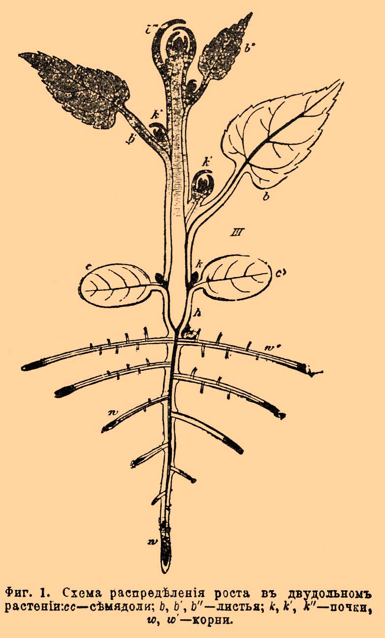 Фиг. 1. Схема распределения роста в двудольном растении: cc — семядоли; b, b', b" — листья; k, k', k" — почки; w, w' — корни.