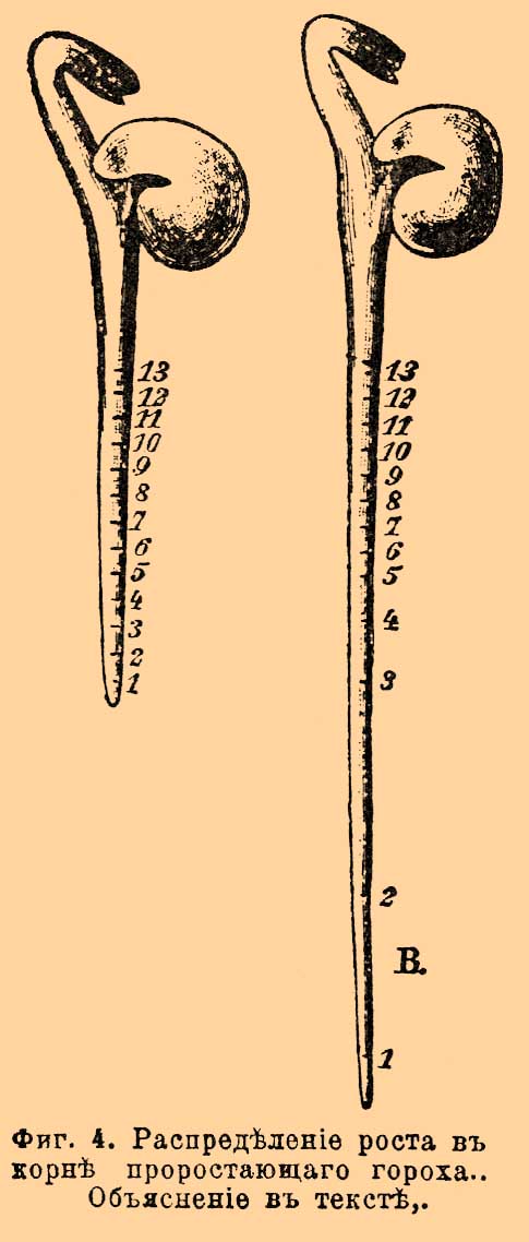 Фиг. 4. Распределение роста в корне прорастающего гороха. Объяснение в тексте.