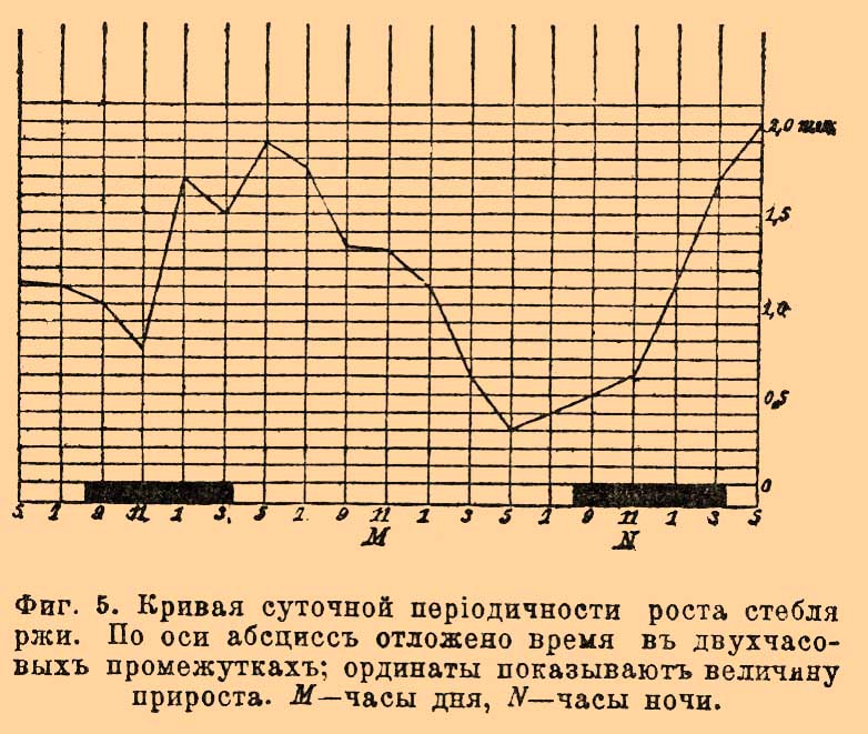 Причины этого различия — созданная естественным подбором привычка растений к тем или иным климатическим условиям. Нужно заметить, что температура, наиболее благоприятная для быстрого роста, не совпадает с температурой наилучшего развития. Воспитывая растение при температурах, близких к оптимуму Р., мы достигаем того, что оно будет расти очень быстро, но в то же время получит болезненный вид: стебель будет ненормально длинный, тонкий и слабый, листья длинны, узки и т. д. Даже если наружный вид растения и не изменится значительно, растение будет слабо, мало выносливо и впоследствии легко погибнет от незначительных неблагоприятных воздействий, как это нередко приходится наблюдать на растениях комнатной культуры, спешно выгоняемых для продажи в оранжереях и парниках. Из других внешних условий для Р. необходимо присутствие кислорода: в бескислородной среде растения, за исключением некоторых простейших (см. Анаэробы), не растут. Но наиболее сильное влияние на Р. оказывает свет: не только отсутствие его, но и недостаточность вызывает существенные отклонения в явлениях Р. Вообще свет замедляет Р. растения, причем наиболее сильно действуют сине-фиолетовые лучи. Но, выращенное без света или при недостаточном освещении, растение получает чрезвычайно характерный болезненный вид; междоузлия его сильно вытягиваются, вследствие чего, в общем, Р. его больше нормального, но в то же время стебель развивается очень слабо; ткани его мало дифференцированы, оболочки клеток слабо утолщены; преобладает тонкостенная водянистая паренхима, вследствие чего стебель очень непрочен. Полегание хлебов при чрезмерной густоте посевов и есть следствие этой слабости стебля (соломины), выросшего при сильном затенении. Еще более резкому изменению подвергаются листья, черешки которых удлиняются, подобно стеблю, пластинки же развиваются крайне слабо и долгое время остаются сложенными. Такие растения называют этиолированными. Чем слабее освещение, тем сильнее этиолирование. В полной темноте к этому присоединяется еще отсутствие хлорофилла: вместо зеленого, растения оказываются окрашенными в светло-желтый цвет [ Замечательно, с другой стороны, что если оставить все растение на свету и только развивающиеся цветы поместить в темный приемник, то они вырастут совершенно нормально, даже окраска их в большинстве случаев бывает нормальной — отсутствует только зеленый цвет, так как хлорофилл в темноте не образуется. ]. Таким образом, свет служит регулятором, задерживающим рост одних органов и усиливающим Р. других. Точного объяснения такого влияния его еще не достигнуто. В связи с регулирующим влиянием света находится и суточная периодичность Р. Дело в том, что Р. растений происходит неравномерно не только в течение года, но и в течение суток. Если, при помощи регистрирующих аппаратов, заставить растение записывать свой прирост на закопченной бумаге, то получается кривая, подобная изображенной на фиг. 5 Кривая эта показывает, что в течение дня Р. ослабевает и к концу его достигает минимума, ночью он усиливается и к утру имеет наибольшую величину.