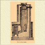 Главная особенность их в том, что канал печи не вертикален, а идет зигзагообразно. Печи строятся парные, и каждая пара имеет одну общую воронку для загрузки руды и часто одно выгребное отверстие. Из стенки, отделяющей две смежные шахты, выдаются внутрь выступы из огнеупорного кирпича; выступы эти идут на известном расстоянии один над другим по обе стороны стенки под углом в 45° Подобные же выступы идут из противоположной стенки каждой шахты, направляясь перпендикулярно к первым и не доходя до них на известное расстояние; образуется таким образом узкая щель. Руда, передвигаясь в печи, должна как бы сваливаться с одной полки на другую, представляя очень большую поверхность для обжигания. С передней и с задней стороны печи находятся газовые камеры, которые сообщаются с внутренностью печи отверстиями, лежащими под выступами. Топочные газы, смешанные с воздухом (входящим через особые отверстия), входят через эти отверстия под выступами в печь, проходят над рудой, идут в заднюю камеру, меняя направление, поднимаясь выше — снова входят в печь, и так далее; они проходят над рудой, пока, окончательно охладившись, не уйдут из печи. Так как вообще переработка мелкой руды в вертикальных печах затруднительна, то еще в середине этого столетия предложены были для этой цели пламенные печи (Alberti). Они имеют горизонтальный под; в передней части пода находится топка, а в задней, над подом — воронка для загрузки руды: через дверку, находящуюся в передней части печи, рабочий может распределять руду по поду; под у топки имеет отверстие, в которое можно выгребать обожженную руду. Топочные газы с избытком воздуха проходят над рудой, входят в холодильник из чугунных труб, затем в кирпичные камеры, по трубам вновь возвращаются к печи и здесь через вытяжную трубу выходят вон.