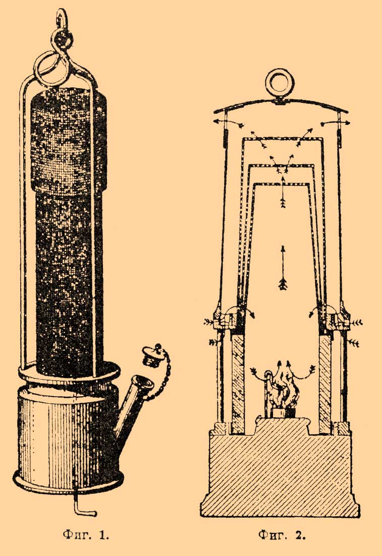 Предохранительные лампы. Для устранения поводов для взрыва уже готовой смеси необходимо употреблять лишь одни предохранительные лампы и так называемые безопасные взрывчатые вещества. К сожалению, на практике встречается деление рудников на рудники с большим и с малым содержанием Р. газа, причем в последних нередко допускаются обыкновенные лампы. Из весьма большого числа предложенных предохранительных ламп практичными оказались лишь очень немногие, которые и удержались в употреблении; остальные же обыкновенно имеют недостаток чрезвычайной сложности конструкции. Прототипом служит лампа Деви (см.), изображенная на фиг. 1. Она представляет большую опасность при всякого рода быстром движении, например при падении, так как при этом пламя легко распространяется за пределы сетки. Поэтому в настоящее время она почти оставлена. Сверх того она дает очень мало света. Однако она удобна для осмотра выработок перед работами с целью определения присутствия Р. газа — оно узнается потому, что пламя лампы почти тотчас же очень слабеет при перенесении ее из взрывчатой среды в атмосферу относительно чистого воздуха. Кроме того, это почти единственная лампа, которая при этих условиях не тухнет. Однако подобные испытания требуют осторожности и большой опытности. Усовершенствованием лампы Деви является лампа Кланни (Boty, Wolf'a, саарбрюкенская). В ней нижняя часть сетки заменена стеклянным цилиндром, отчего она дает втрое больше света (около ⅓ норм. свечи). Лампа гаснет сама при перенесении ее из среды с Р. газом в чистый воздух, вследствие чего рабочий не может вносить лампу во взрывчатую смесь несколько раз, и следовательно, в этом отношении она безопаснее предыдущей. Она нередко гаснет и при медленном внесении в гремучую смесь, вследствие развивающихся при этом колебательных движений воздуха. При наклонении гаснет реже других ламп. Наибольшим распространением во Франции пользуется лампа Марсо (фиг. 2).