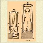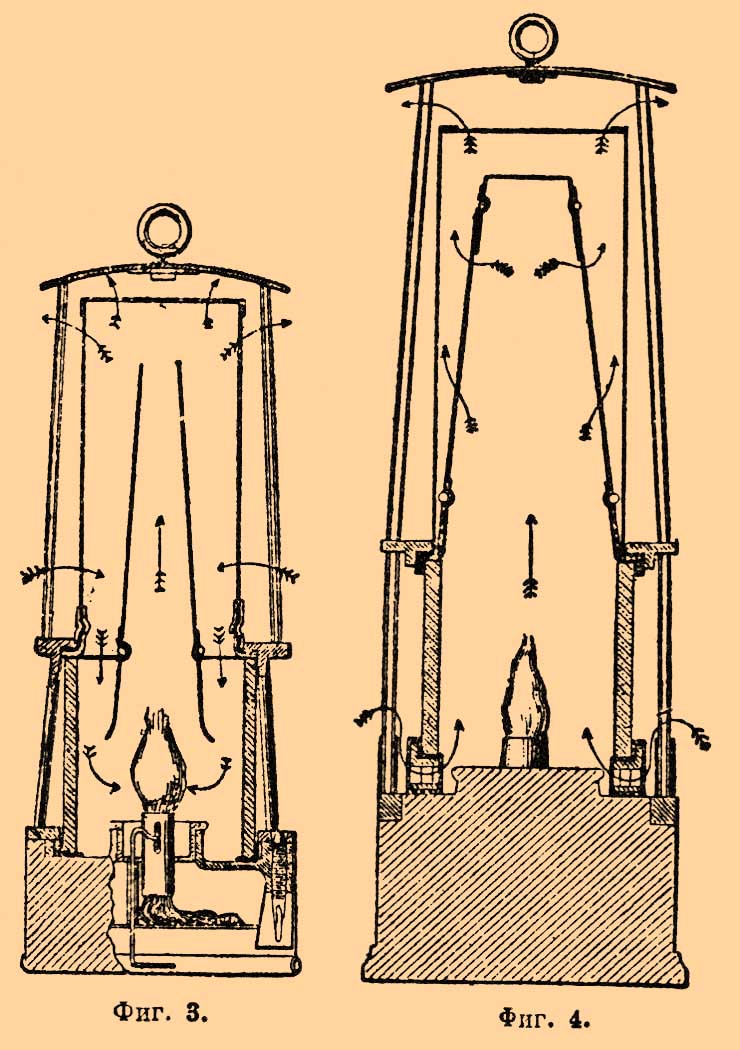 Вследствие того, что в ней сетка окружена снаружи металлическим колпаком, защищающим пламя от действия наружных струй воздуха, а сетку от механических повреждений — эта лампа еще более безопасна. К недостаткам ее относится легкость потухания и возможность забыть надеть сетку, так как последней не видно снаружи. Лампа Мюзелера (фиг. 3) отличается от лампы Кланни присутствием горизонтальной сетчатой диафрагмы, сквозь которую проходит суживающаяся кверху труба. При внесении в среду с большим содержанием газа пламя лампы заполняет всю нижнюю часть ее и продукты горения, выходя через отверстия диафрагмы навстречу притоку свежего воздуха, нарушают правильную циркуляцию последнего и лампа тухнет. Недостаток ее состоит в том, что она легко тухнет даже при небольшом наклонении. Лампа Фюма (фиг. 4) отличается тем, что свежий воздух притекает снизу из-под стекла через ряд отверстий, закрытых сеткой.