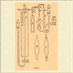 Он состоит из: 1) калиброванной измерительной трубки A, окруженной широкой муфтой с водой для предотвращения быстрых колебаний температуры (измеряемой термометром T) во время опыта; 2) удлиненного колокола B, погруженного в сосуд с раствором едкого кали, для поглощения углекислоты; 3) грушевидного сосуда C, заключающего платиновую спираль, накаливанием которой (током) пользуются для сжигания метана; и 4) водяного манометра DHF. Все эти части соединены между собой капиллярными трубками с кранами h1, h2, h3, позволяющими выключать любую из вышеупомянутых частей или соединять одну из них с любой из остальных. Трубка A и сосуд C соединены каучуковыми трубками с резервуарами E и G для ртути. Ход анализа состоит в следующем: 1) соответствующим движением резервуаров E и G с ртутью, при надлежащих поворотах кранов, все сосуды наполняют жидкостями до меток m1, m2, m3, m4 (A и C — ртутью, B — раствором едкого кали, D — водой). 2) Разобщив B от трубки A, соединяют последнюю, через капилляр a, с резервуаром, содержащим анализируемый газ, и, опуская сосуд E, набирают в нее некоторое количество газа. 3) Выключив резервуар с газом, соединяют A с водяным манометром и соответствующими движениями сосудов F и E устанавливают этот последний на черте т 4, затем замечают температуру и отсчитывают объем V1 газа в измерительной трубке. 4) Сообщив A с B и поднимая сосуд E, перегоняют газ в B для поглощения углекислоты, после чего не поглощенный остаток переводят (опуская E) обратно в A и, установив манометр на метке т 4, измеряют объем газа V2. Разность V1—V2 даст объем углекислоты. 5) Далее, устанавливая надлежащее сообщение, переводят газ сперва в C для сжигания, затем в B для поглощения образовавшейся при горении метана углекислоты и наконец в A для измерения объема V3 не поглощенного остатка (азота). Манометр, конечно, должен быть установлен на черте т 4. Объем метана будет равен V2—V3 /3. Таким образом все составные части Р. воздуха будут определены. Остается еще заметить, во-первых, что во избежание поправки на влажность, анализируемый газ должен быть при измерении объемов насыщен водяным паром, для чего в трубке A всегда должно находиться небольшое количество жидкой воды; во-вторых, что, в случае изменения температуры во время опыта, истинные объемы получают не вычислением, а эмпирически, исправляя наблюдаемые объемы надлежащей установкой мениска водяного манометра в трубке D (опуская или поднимая F) наконец, в-третьих, что, если анализируемая проба газа содержит кислорода менее, чем это необходимо для полного сожигания, то приходится предварительно нарочно прибавлять к газу определенное количество воздуха. Для собирания и хранения взятых проб Р. газа служат обыкновенно стеклянные трубки (см. фиг. 7, K и L) со стеклянными же кранами (L) или совсем без кранов (K); в последнем случае они затыкаются каучуковыми пробками и заливаются какой-либо мастикой, например, Менделеева (см.); такой способ закупоривания надежнее кранов.