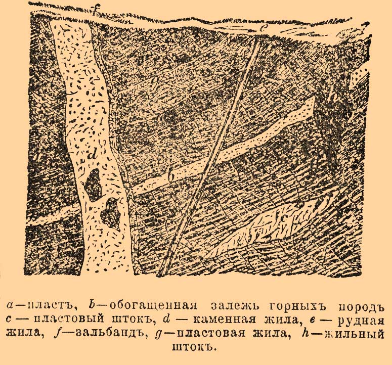 a — пласт, b — обогащенная залежь горных пород, c — пластовый шток, d — каменная жила, e — рудная жила, f — зальбанд, g — пластовая жила, h — жильный шток.
