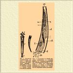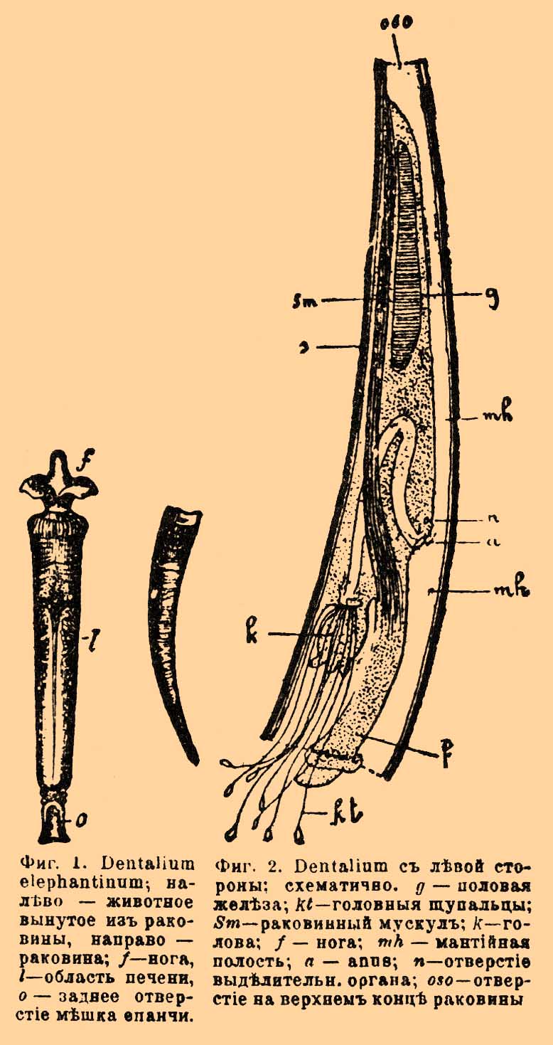 Фиг. 1. Dentalium elephantinum, налево — животное вынутое из раковины, направо — раковина; f — нога, l — область печени, о — заднее отверcтиe мешка епанчи. Фиг. 2. Dentalium с левой стороны; схематично. g — половая железа, kt — головные щупальца; Sm — раковинный мускул; k — голова; f — нога; mh — майтийная полость; а — anus; n — отверстие выделительн. органа; оsо — отверстие на верхнем конце раковины.