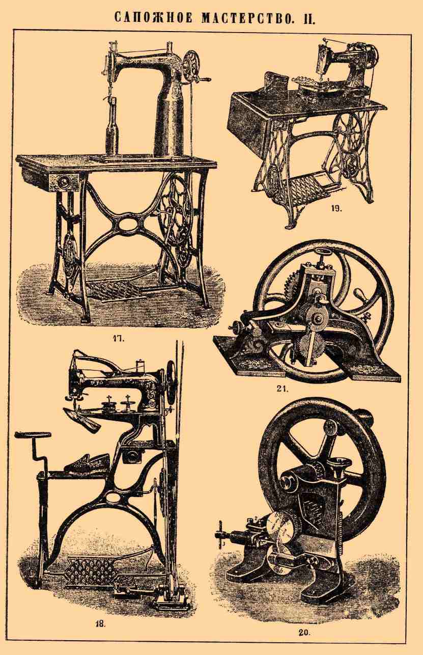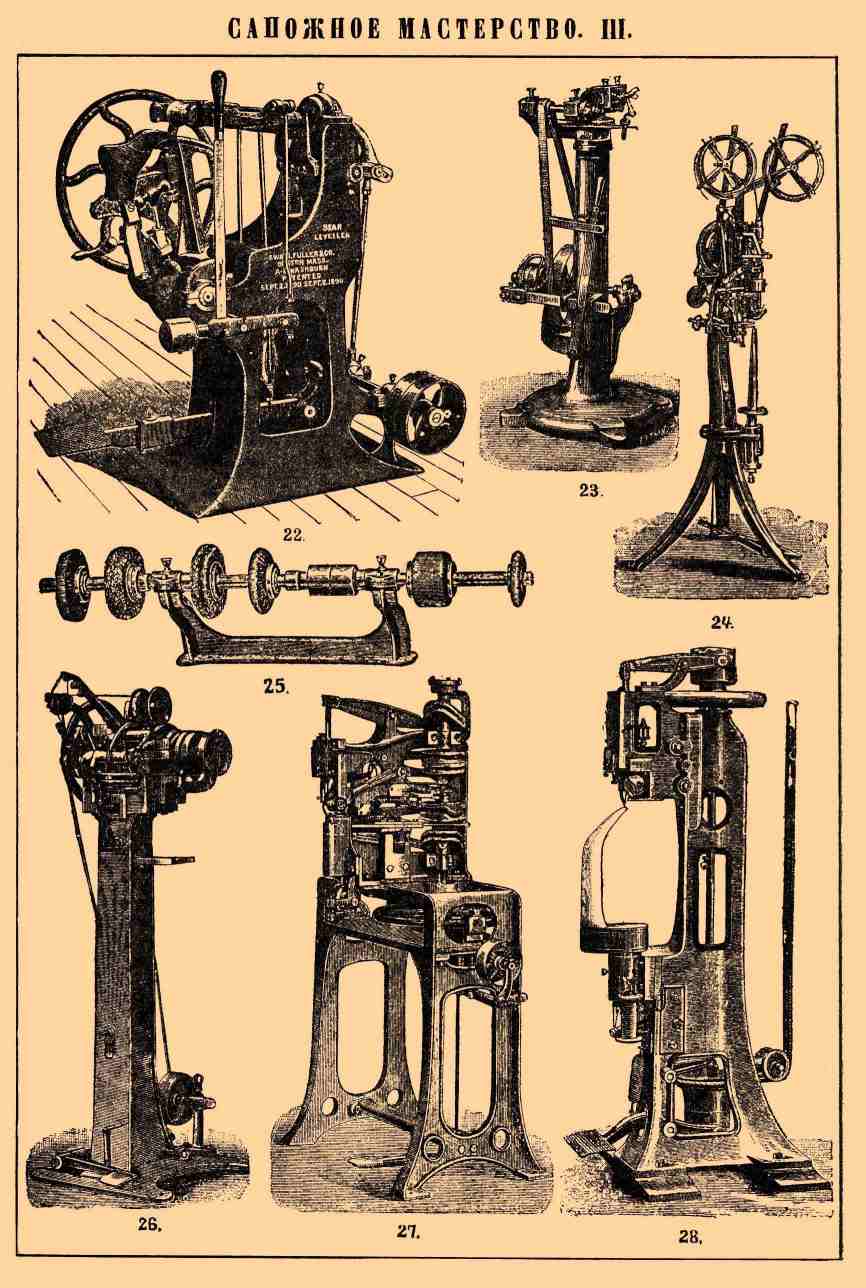 Сапожное мастерство. — В настоящее время сапожники и башмачники редко изготовляют сами всю обувь, но приобретают верхнюю часть у "заготовщиков" и ограничиваются прилаживанием подошвы по мерке. Такое разделение труда было вызвано главным образом распространением скороработающих швейных машин. Для легкой обуви употребляются кожи — сафьян, шагрень, лайка, и ткани — ластик, прюнель, парусина, плис — и т. п.; из всех этих материалов верх обуви выкраивается и сшивается "заготовщиками", обыкновенной машинной строчкою, в две нитки. Для такой работы нужны три типа швейных машин: для строчки более удобна машина со столбом (табл. II, фиг. 17), потому что она допускает самую разнообразную работу; особая обшивная машина (табл. II, фиг. 18), прострачивающая ремешки, которыми обшивают край легкой обуви, и машина Зингера для обметки петлей (табл. II, фиг. 19). Для сапог "вытяжных", из телячьей дубленой кожи "опойки", или из более грубой коровьей кожи "выростка", или же из лошадиной, которая мало ценится, несмотря на свой красивый вид, так как плохо пропускает испарину, переднюю часть сапога, так наз. "крюк", изготовляют особые "кожевенные" мастера. Они обыкновенно начинают с того, что строгают кожу с изнанки, так называемой "бухтармы", чтобы придать ей везде равную толщину и гладкость, затем выкраивают "крюк", сильно размачивают его в теплой воде и натягивают руками с помощью особого винтового зажима на форму, вырезанную из доски (табл. I, фиг. 3); прибитый, где нужно, гвоздями "крюк" оставляют сохнуть на форме, и он потом более не изменяет своего вида. Кожа при этом садится в "подъеме" и растягивается по краям (как видно на фиг. 3 по чертам, проведенным на вытягиваемой коже). Кроме строчки, машинной или ручной, сапожники употребляют еще "шов" в один конец и "тачание в два конца". При этом не пользуются иголками, а в конец, пропитанный варом (см.), нити "всучивают" длинную упругую щетинку, легко проникающую через прямой или изогнутый прокол, предварительно сделанный в коже шилом. Делается это для получения шва плотного, непроницаемого для пыли и даже для воды: пока игла проходит через проколотое ею отверстие с нитью, сложенною вдвое, она временно раздвигает упругую ткань, но в малоупругой коже она оставляет проход, не вполне заполняющийся нитью. Напротив того, щетинка в заостренном конце С. "дратвы" тоньше самой этой дратвы, так что ее можно протянуть через отверстие, как раз равное поперечному сечению дратвы. Кроме того, липкий вар приклеивается к коже и не допускает расползания шва даже тогда, когда перетрутся части дратвы, выступающие наружу. Для тачания и сшивки употребляется дратва, ссученная из пеньковой или льняной "пряжи" в 4—15 нитей. Для приготовления "конца" такой дратвы, который должен соответствовать длине предполагаемого шва, наматывают пряжу через локоть и пальцы руки так, чтобы получился моток такой длины и во столько нитей, сколько нужно, и перерезывают его в одном месте. У каждой нити полученного пучка параллельных нитей равной длины раскручивают одно место, вершка на 4 от конца, катая его ладонью по колену своей ноги от себя (потому что волокна нити скручены как левый винт), и затем разрывают ее на этом месте: получается растрепанный конец, в котором отдельные волокна имеют неодинаковую длину. Повторив ту же операцию с другими концами пряжи, отдельные нити натираю