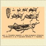 Фиг. 2. Развитие саранчи. А — яйцо и разные возрасты насекомого; a, b, c, — грудные кольца, b', c — крылья.