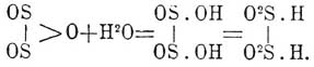 Известна еще одна кислота, получаемая из сернистой при действии металлического цинка, который растворяется в сернистой кислоте без выделения водорода. Эта так назыв. водородосернистая кислота открыта Шютценбергером; по позднейшим исследованиям (Бернтсен), ее частица Н 2S2O4, что следует из состава солей (они кристалличны, свободная же кислота так непостоянна, что разлагается уже в растворе на С. и сернистую кислоту) и из отношений при окислении: 1 атом кислорода переводит их в соли сернистой, а 3 атома в соли серной кислоты: