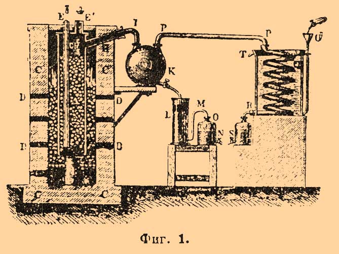 В печи С на чугунной тумбе В стоит чугунная реторта А в 2 м высоты, 30 стм диам. и 6 стм толщины; стенки ее вымазаны глиной снаружи и внутри. В крышке реторты находятся отверстия Ε и E', через Е' загружается по мере надобности древесный уголь; в E вставлена фарфоровая трубка с, не достигающая нa 8—10 стм дна реторты, на котором лежит слой кокса. Фарфоровая трубка служит для питания реторты серой, которую от времени до времени бросают в трубку. Реторта имеет тубулус Н, который соединяется с глиняным двугорлым баллоном I; в другое горло баллона вмазана гончарная труба P, ведущая к змеевику Q. Операция ведется следующим образом. На дно реторты насыпают слой кокса, вставляют фарфоровую трубку, заполняют всю реторту древесным углем и начинают ее накаливать. Когда температура достигла вишнево-красного каления, о чем судят через отверстия в кирпичной кладке печи D, в фарфоровую трубку бросают серу и закрывают ее пробкой. Образующийся С. частью сгущается в баллоне I, частью в холодильнике Q. Из баллона С. стекает в флорентийский сосуд L, где собирается под водой и вытекает через сифон М в склянку N. Серу бросают в реторту почти через каждые 10 минут, уголь же загружают 1—2 раза в сутки, так что операция ведется непрерывно и останавливается только изредка для чистки реторты от накопившихся остатков, что сопряжено с большими неудобствами благодаря выделению из нее удушливых паров. Выход С., по опытам Сидо, на 5 г угля при темно-красном калении составляет 17 г, при вишнево-красном — 23 г и светло-красном — 12,7 г. Более накаленной является нижняя часть реторты, где происходит почти вся реакция, верхняя же часть для уменьшения диссоциации С. держится при более низкой температуре. Реторта дает около 100 кг С. в сутки. Так как С. очень летуч и пары его легко воспламеняются, то при фабрикации его должны строго соблюдаться все противопожарные предосторожности. Вместе с С. при действии серы на уголь образуется сероокись углерода, сернистый газ и другие неприятно пахнущие соединения, которые проходят, не сгущаясь, через холодильник и, выходя наружу, отравляют окружающую атмосферу. Чтобы устранить это, в некоторых аппаратах газы из холодильника пропускают через известь или, еще лучше, через ящики, наполненные массой, служащей для очистки светильного газа (Ламингова масса, см.), отсюда потом извлекают серу (см. Сера, техн.). Гораздо более усовершенствованные аппараты употребляются на английских фабриках (фиг. 2).