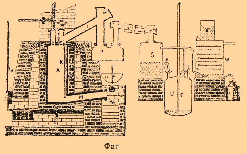 Чугунная или гончарная реторта А помещается в печи D, внутренние стенки которой D' из огнеупорного кирпича; в стенке проделано отверстие d, чтобы следить за нагреванием реторты; Е — решетка, Е' — зольник. Около реторты, отступя на 1 стм от ее стенок, делается кожух — тоже из огнеупорного кирпича. Внизу реторта имеет длинный и широкий отросток М; через него очищают реторту время от времени от накопляющихся остатков; чистка производится через дверь n; остатки сбрасываются в яму N, из которой идет вытяжной канал т для паров. В этот же отросток М льется по трубке о сера, которая держится расплавленною в котле О с клапаном с'. В реторте сверху находятся две горловины С, С'; через одну из них С' производится загрузка угля; в это же время к другому подводят вытяжную трубу Н, которая проходит через крышу здания и выводит выделяющиеся из реторт пары наружу. Отводная труба для С. I идет, поднимаясь вверх; здесь сгущаются пары серы, не вошедшей в реакцию. Жидкая сера стекает при помощи отростка К вновь на дно реторты и не падает на поверхность реторты, как в аппарате Перонселя. Для окончательного освобождения С. от серы служит резервуар Р. Пары С. проходят P и сгущаются в холодильнике Q, с которым при помощи трубки Т соединяется приемник S для жидкого С. Из приемника С. по сифону р стекает в резервуар, из которого давлением воздуха при помощи трубок r и q посылается в склад. Газы, не сгустившиеся в S (преимущественно сероводород), по трубке s идут в промывочный аппарат W с горизонтальными полками, по которым течет масло из сосуда X; здесь задерживаются следы С., уносимого газами. Масло собирается в приемнике V и затем из него отгоняется С. После выхода из промывочного аппарата газ очищается от сероводорода при помощи извести и окиси железа и уже затем выпускается в атмосферу. Сера приливается в реторту через каждые 5 мин. в количестве 0,6—0,8 кг; уголь загружается через 8 час.; он предварительно прокаливается, для чего пользуются теряющимся жаром печи; реторта чистится 1 раз в неделю и дает 200—220 кило С. ежедневно. В различное время делалось много попыток получать С. непосредственно из природных сернистых соединений — колчеданов, гипса и пр., но до сих пор они мало имеют значения для практики.