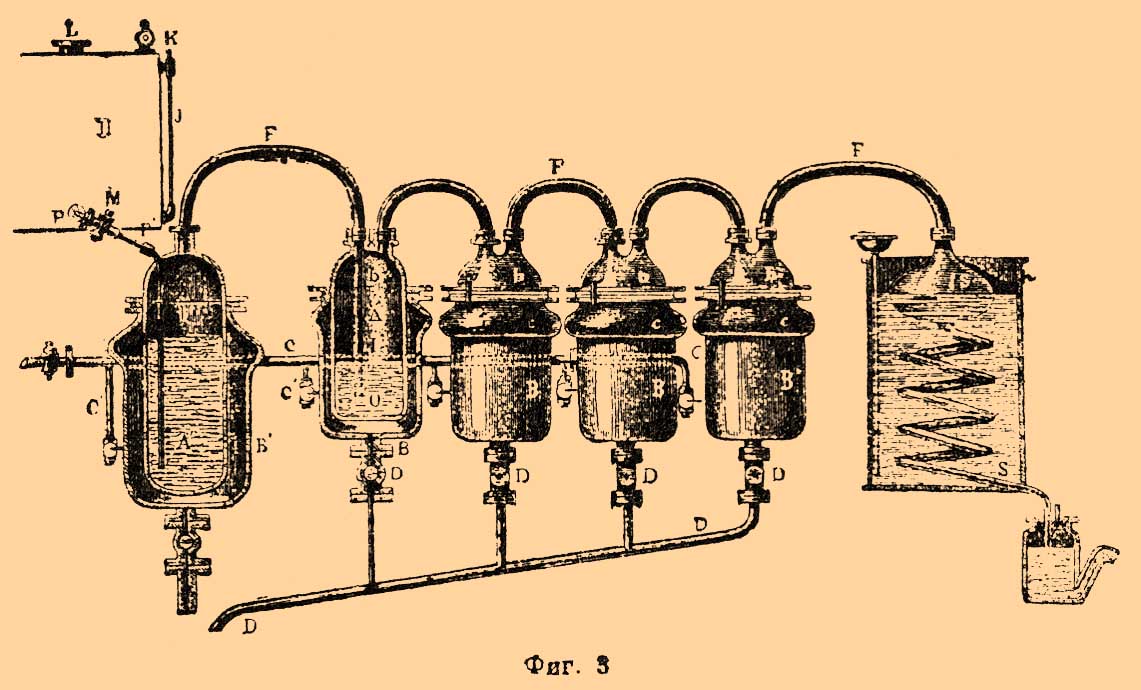Очищение. С., полученный вышеописанными способами, содержит в растворе 10—12% серы, сероводород и различные сернистые органические вещества. Чтобы очистить сырой С., его подвергают перегонке и обрабатывают различными реагентами: щелочами, белильной известью, азотно-свинцовой солью и пр. Очищение С. сопровождается большими потерями его (до 25%). Боньер производит перегонку С. в серии котлов В В В B (фиг. 3).