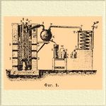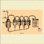 Котлы делаются с двойными стенками; между последними циркулирует пар, который берется из паропровода С и ведется к каждому котлу при помощи отростков C'. Конденсационная вода спускается из котлов через краны D в общую сточную трубу D'. Котел А' наполняется крепким раствором едкого кали и нагревается до 60—65°; в него при помощи трубки P напускается С. из хранителя Н; количество С. определяется по водомерной трубке J. Котлы B двугорлые; они наполнены частью щелочью, частью растворами солей свинца, меди и железа и соединены между собой трубопроводами F, идущими от верхушки шлема одного котла до дна следующего. Пары С. по трубе F идут из одного котла в нижнюю часть другого, проходят через слой промывочной жидкости и, наконец, поступают в холодильник S, где и сгущаются. Дейсс перегоняет С. в большом железном котле, который до 2/3 наполняется С.; сюда приливают несколько литров щелочи, хлорной воды или раствора белильной извести; котел нагревается паром, причем гонку ведут очень медленно. По Зингеру, сырой С. обрабатывается в цилиндре (2 м высоты и 0,7 м диам.) прозрачным известковым раствором, который впрыскивается в него при помощи свинцовой дырчатой трубки, лежащей на дне цилиндра; обработка кончается, когда вытекающий сверху цилиндра известковый раствор оказывается прозрачным. К промытому таким образом С. прибавляют 1% жира и перегоняют на водяной бане, покрыв С. слоем воды в 1 стм. Для получения химически чистого С. из продажного Клоез советует взбалтывать его с ½ % сулемы и перегонять, прибавив 2% бесцветного жира. Сидо взбалтывает его перед перегонкой с ртутью. По Обаху, для окончательного очищения С. поступают следующим образом: продажный С. процеживают через фильтр в колбу с негашеной известью, оставляют на некоторое время и затем отгоняют (не до конца) на водяной ванне, которая держится при 60—70°. Дистиллят взбалтывают с грубо измельченным порошком марганцово-калиевой соли (5 г на 1 литр С.) и оставляют стоять, пока не исчезнет запах сероводорода; затем С. сливают и сначала сильно взбалтывают с несколькими граммами чистой ртути, а потом с сернокислой ртутью (25 г на 1 л. CS 2), пока не исчезнет редечный запах. После такой обработки С. сливают в колбу с хлористым кальцием (пористым), откуда его перегоняют (не на свету) в сухие склянки, где он и хранится в темноте.