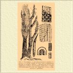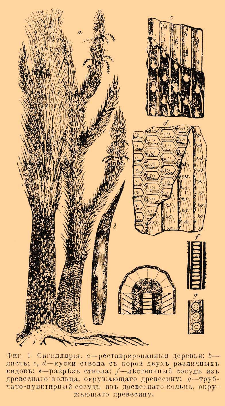 Фиг. 1. Сигиллярия. а — реставрированные деревья; b — лист; с, d — куски ствола с корой двух различных видов; e — разрез ствола; f — лестничный сосуд из древесного кольца, окружающего древесину; g — трубчато-пунктирный сосуд из древесного кольца, окружающего древесину.