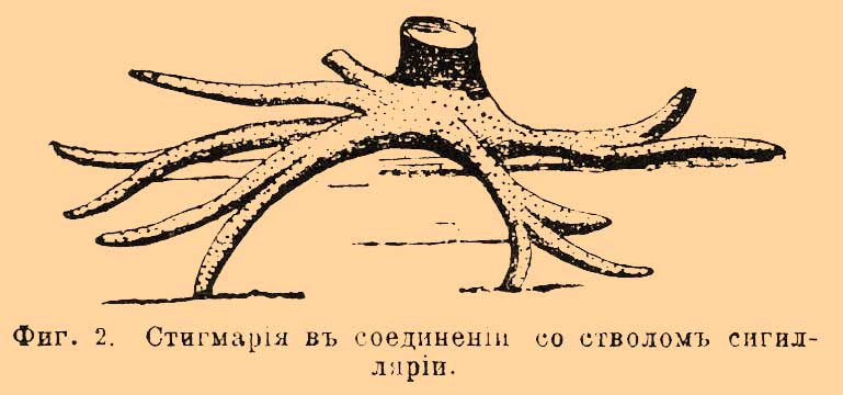 Стигмарии часто находят в слоях, подстилающих слои со стволами С.; они имеют наичаще вид невысокого пенька, от нижней части которого отходят в разные стороны четыре (редко более) длинных, иногда дихотомирующих отростка, покрытых мелкими круглыми рубчиками. Эти отростки, как предполагают, тянулись горизонтально по поверхности почвы, а наблюдаемые на них рубчики служили местами прикрепления настоящих корней, а как допускают некоторые ученые, также и листьев, отличных по форме от тех, которыми были усажены стволы С.