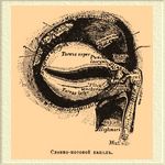 Края желобка замыкаются, и он превращается в канал, по коему выделения желез, открывающихся в упомянутую полость, удаляются в носовую полость. Впрочем, у млекопитающих желобок этот не прямо переходит при развитии в канал, а сначала образует эпителиальное набухание, в котором появляется позже просвет. У млекопитающих, в частности у человека, этот канал, подходя к полости, ограниченной веками, раздваивается и идет под именем двух слезных каналов (с. lacrymales), из коих каждый заканчивается на внутреннем краю верхнего и нижнего века отверстием: слезной точкой (punctum lacrymale). Эти точки каждый легко может наблюдать в своем глазу в виде маленьких дырочек, помещающихся на маленьких бугорочках (рарillа lacrymalis).