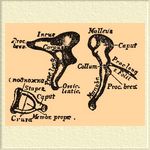 К длинному отростку прикрепляется весьма важная мышца (m. laxator tympani), служащая для ослабления натяжения барабанной перепонки (см. Слух), а к короткому — другой важный мускул, напрягающий перепонку (m. tensor tympani). Вторая косточка — наковальня (inxus) — действительно имеет форму наковальни, состоящей из тела, снабженного двумя отростками: коротким, прикрепленным к барабанной перепонке посредством связки, и длинным, который на конце снабжен апофизом, считаемым иногда за самостоятельную (т. наз. чечевицеобразную) косточку (ossiculum lenticulare Sylvii). K этой косточке примыкает 3-я косточка — стремя, а наружная поверхность тела наковальни имеет углубление, в которое принимает головку молоточка. Стремя (stapes) состоит из головки, сочленяющейся с чечевицеобразной косточкой, и двух отходящих от головки и изогнутых дужек (crura), ограничивающих пространство, затянутое особой перепонкой (membrana propr i a stapidis) и упирающихся в третью составную часть стремени — в подножку, запирающую овальное окно лабиринта. Columella auris представляет обыкновенно полочковидную косточку, упирающуюся одним концом в барабанную перепонку, а другим в овальное окно. У многих низших млекопитающих стремя имеет ту же форму столбика, но у высших — вместо столбика имеем два колена, между коими проходит артерия, которая, впрочем, лишь у немногих млекопитающих (грызунов, насекомоядных) остается на всю жизнь, а у большинства, в том числе у человека, исчезает.