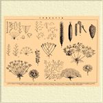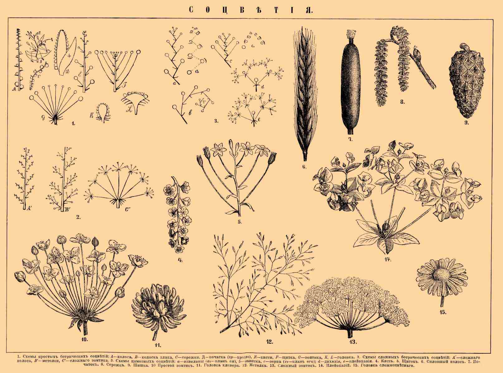 1. Схемы простых ботрических соцветий: A — колоса, B — колоска злака, C — сережки, D — початка (sp — крыло), E — кисти, F — щитка, G — зонтика, K, L — головки. 2. Схемы сложных ботрических соцветий: A' — сложного колоса, B' — метелки, C' — сложного зонтика. 3. Схемы цимозных соцветий: a — извилины (a1 — план ее), b — завитка, c — серпа (c1 — план его), d — дихазия, e — плейохазия. 4. Кисть. 5. Щиток. 6. Сплошной колос. 7. Початок. 8. Сережка. 9. Шишка. 10. Простой зонтик. 11. Головка клевера. 12. Метелка. 13. Сложный зонтик. 14. Плейохазий. 15. Головка сложноцветного.
