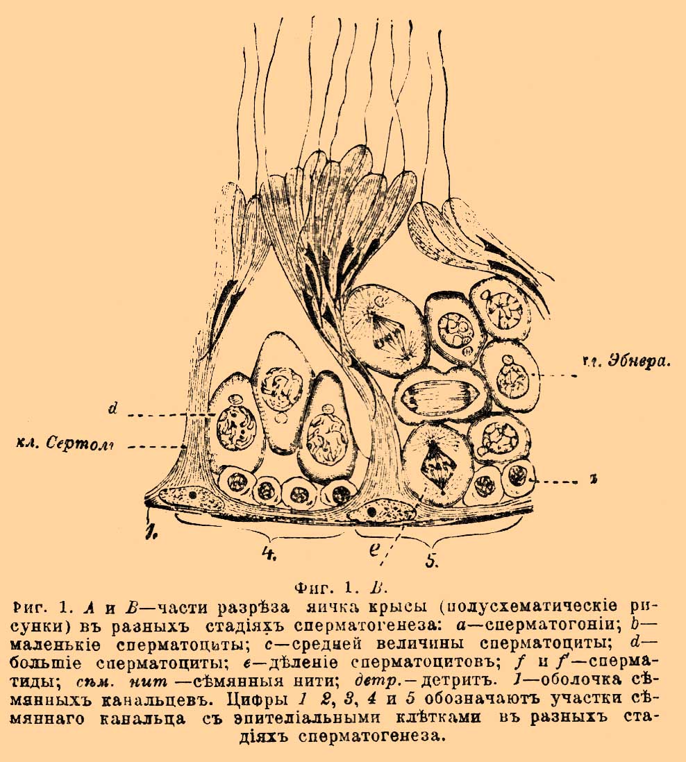 фиг. 1. A и B — части разреза яичка крысы (полусхематические рисунки) в разных стадиях сперматогенеза: a — сперматогонии; b — маленькие сперматоциты; c — средней величины сперматоциты; d — большие сперматоциты; e — деление сперматоцитов; ƒ и ƒ' — сперматиды, сем. нит — семенные нити; детр. — детрит. l — оболочка семенных канальцев. Цифры 1, 2, 3, 4 и 5 обозначают участки семенного канальца с эпителиальными клетками в разных стадиях сперматогенеза.
