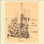 После указанных превращений сперматоцитов наступает второй период их жизни — период деления, характеризующийся тем, что большие сперматоциты дважды подвергаются митотическому делению, причем, во время второго митоза, количество протоплазмы во вновь образовавшихся клетках должно значительно уменьшиться, откуда и произошло название "больших и малых митозов" (фиг. 1 B, e). Между этими двумя формами митоза существует, однако, промежуточная форма клеток, ядра которых находятся некоторое время в состоянии покоя. Означенную форму клеток называют сперматоцитами второго порядка или, вернее, Эбнеровскими клетками (фиг. 1 В, кл. Эбнера). Продуктом деления этих последних являются так называемые сперматиды (см.) — маленькие угловатые клетки (фиг. 1 A, f). Образованием сперматидов оканчивается второй и начинается третий и последний период — превращения указанных клеток в семенные клетки. Прежде всего ядра сперматидов принимают эллипсовидную форму и постепенно отодвигаются к той части клетки, которая обращена в сторону стенки семенного канальца (фиг. 1 A, f, 3). Далее, количество протоплазмы уменьшается и, в конце концов, лишь ничтожный остаток ее окружает ядро каждой клетки сперматида, превращающейся в головку семенной нити. В течение всего этого времени сперматиды лежат совершенно свободно, образуя самые внутренние ряды клеток, выстилающих стенку семенного канальца. Но вскоре затем наблюдаются интересные изменения со стороны клеток Сертоли. Они выпускают к просвету канальца довольно длинный отросток, который как бы притягивает к себе превращающиеся в семенные нити сперматиды: известное количество последних сгруппировывается около каждого такого отростка и, погружаясь во внутренний, свободный его конец, вступает с ним в тесное соединение. Вследствие только что описанного процесса, носящего название "копуляции", клетки Сертоли приобретают своеобразный вид (фиг. 1 А и В). Процесс этот имеет огромное значение для развивающихся из сперматидов семенных нитей: молодые семенные нити фиксируются и в то же время получают из протоплазмы клеток Сертоли питательный материал, необходимый для дальнейшего их роста и развития. Постепенно сперматиды превращаются в зрелые сперматозоиды с характерной для них головкой, хвостиком и пр. Все время, пока происходят со сперматидами описанные изменения, они еще торчат пучками в лапчатых разветвлениях клеток Сертоли, но раз уже означенные клетки достигли полной зрелости и превратились в сперматозоидов — связь их с Сертолиевскими клетками нарушается. Отростки последних постепенно исчезают: протоплазма их распадается на множество различной величины хроматофильных шариков и жировых капелек, которыми образуется отдельный слой (фиг. 1 A, детр., 2), причем сперматозоиды делаются совершенно свободными и в свою очередь составляют особенный, самый внутренний слой. Зрелые сперматозоиды собираются группами в осевой части просвета семенных канальцев и затем, в виде готового "секрета", удаляются из них. Этим и оканчивается процесс развития сперматозоидов.