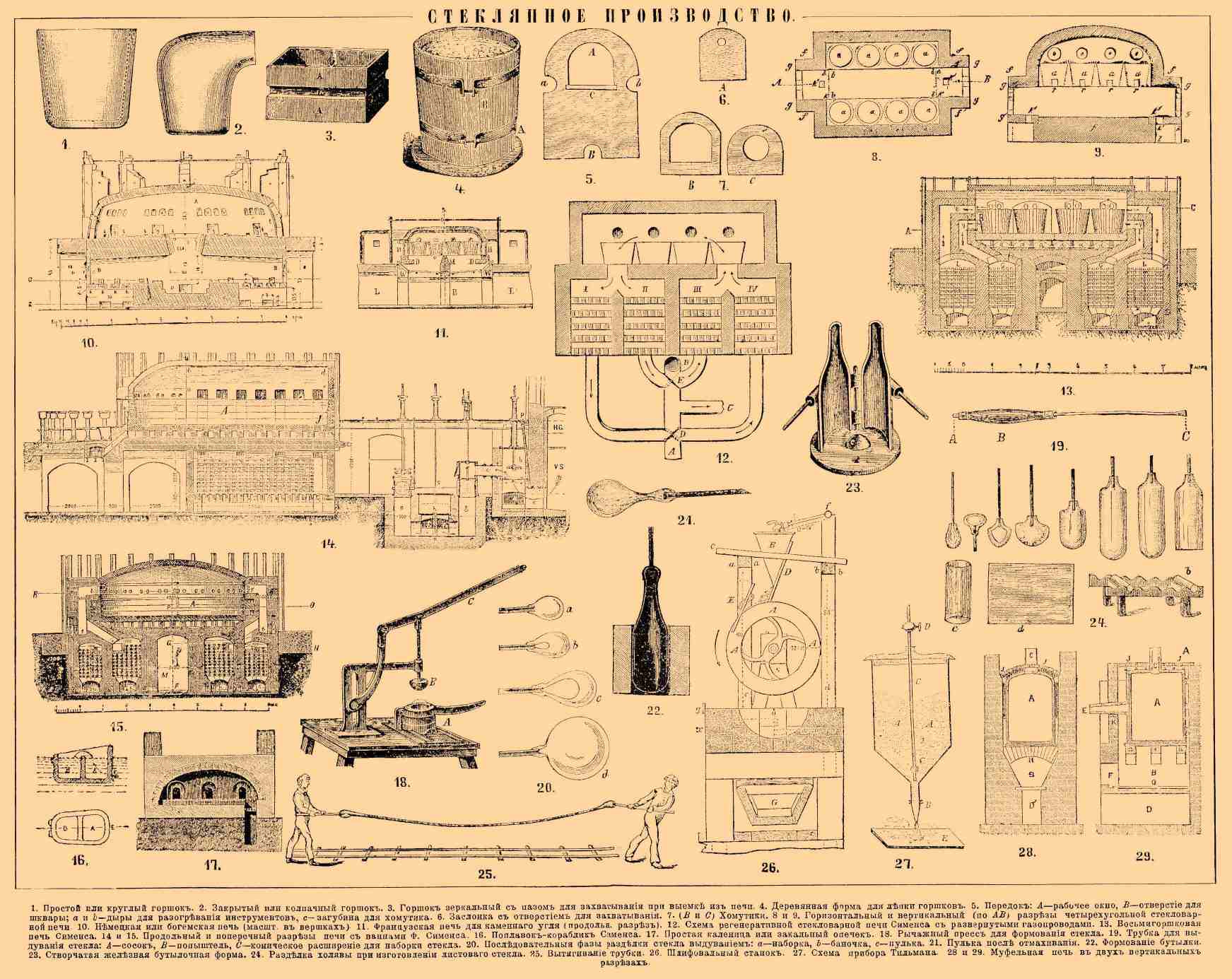1. Простой или круглый горшок. 2. Закрытый, или колпачный, горшок. 3. Горшок зеркальный с пазом для захватывания при выемке из печи. 4. Деревянная форма для лепки горшков. 8 и 9. Горизонтальный и вертикальный (по AB) разрезы четырехугольной стекловарной печи. 10. Немецкая или богемская печь (масштаб в вершках). 11. Французская печь для каменного угля (продольн. разрез.). 12. Схема регенеративной стекловарной печи Сименса с развернутыми газопроводами. 13. Восьмигоршковая печь Сименса. 14 и 15. Продольный и поперечный разрез печи с ваннами Ф. Сименса. 16. Поплавок-кораблик Сименса. 17. Простая каленица, или закальный опечек. 18. Рычажный пресс для формования стекла. 19. Трубка для выдувания стекла: A — сосок, B — папыштель, C — коническое расширение для наборки стекла. 20. Последовательные фазы разделки стекла выдуванием: a — наборка, b — баночка, c — пулька. 21. Пулька после отмахивания. 22. Формование бутылки. 23. Створчатая железная бутылочная форма. 24. Разделка холявы при изготовлении листового стекла. 25. Вытягивание трубки. 26. Шлифовальный станок. 27. Схема прибора Тильмана. 28. Муфельная печь в вертикальном разрезе.