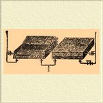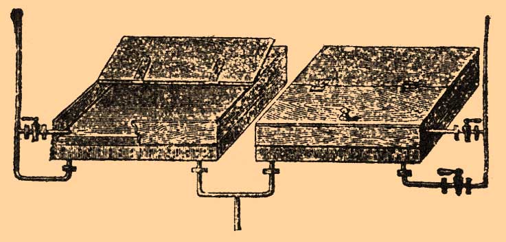 (техн). — Сырым материалом для получения Т. служат различные виды чернильных орешков (см. Дубильные материалы) и особенно восточно-азиатские (китайские и японские), содержащие до 75% Т. и дающие высшие торговые сорта его. Обычный ныне способ получения Т. состоит в следующем: орешки измельчаются в мельницах (см. Т.-экстракт) до степени грубого порошка, который подвергается затем методическому извлечению водою в диффузионных аппаратах, по способу действия совершенно подобных тем, которые в большом виде применяются в сахарном производстве (см.). Водный экстракт, выпускаемый из диффузоров, прогоняется через фильтр и уже совершенно чистый от мути и прозрачный поступает на обработку эфиром, для которого особенно пригоден не очищенный ректификацией сырой эфир, содержащий значительную примесь воды и спирта. Обработка производится в медном цилиндрическом котле с механической мешалкой, дающей возможность хорошо перемешать между собою обе жидкости. Полученная смесь выпускается затем в отстойники, где и отстаивается дней 8—10, при чем она разделяется на два слоя, из которых нижний, густой, представляет водно-эфирный раствор Т. и заключает в себе почти сполна все его количество, а в верхнем, жидком эфирном слое скопляются галловая и уксусная кислоты, жирные, смолистые, красящие вещества и прочие примеси. По отделении нижнего слоя из него отгоняют эфир в кубе надлежащего устройства, с двойным дном (для нагревания паром) и холодильником. Оставшуюся в кубе густую и вязкую массу концентрированного раствора Т. распределяют на цинковых листах и высушивают. Для придания продукту более светлого оттенка цвета и рыхлости его подвергают кратковременной продувке паром, для чего листы с высохшей массой помещают в плоские ящики (см. рис.), нижняя часть которых железная, а верхняя — деревянная.