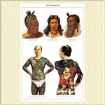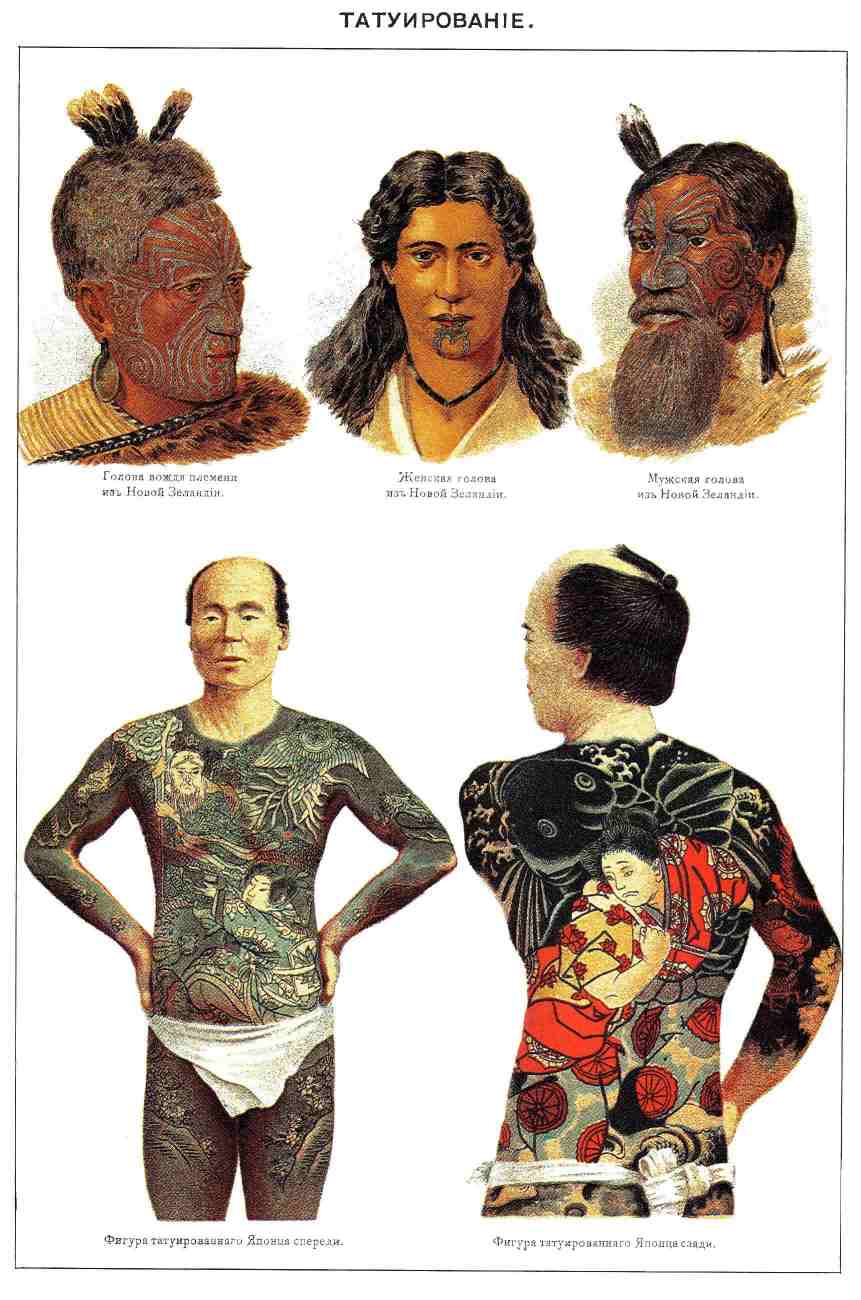 Голова вождя племени из Новой Зеландии. Женская голова из Новой Зеландии. Мужская голова из Новой Зеландии. Фигура татуированного японца спереди. Фигура татуированного японца сзади.