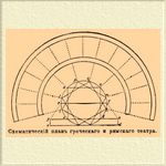 Римский Т., как и римская драма, имеет своим образцом Т. греческий, хотя в некоторых чертах и отличается от него. Места для зрителей в римских Т. занимают небольше полукруга, оканчиваясь в направлении к сцене по линии, параллельной этой последней; сцена имеет длину вдвое большую, нежели в греческом; в римском Т. удобные лестницы ведут из орхестры на сцену, чего не было в греческом; глубина орхестры меньше при той же ширине; входы в орхестру уже; сцена ближе к центру пространства для зрителей. Bсе эти отличия можно наблюдать на развалинах многих римских Т., из которых наилучше сохранившиеся в Аспении, что в Памфилии, и в Оранже (Aransio), во Франции. Витрувий дает точное описание плана и сооружения римских Т., как бы устанавливая два независимых один от другого типа театров. Уклонения римского Т. от греческого объясняются сокращением, потом полным упразднением роли хора и в зависимости от этого делением орхестры на две части: и то, и другое началось еще у греков и только получило у римлян законченное развитие. В римском Т., как и в греческом, пространство мест для зрителей и сцены находилось в зависимости от основного круга и вписанной фигуры. За основную фигуру римского Т. Витрувий принимает четыре равносторонних треугольника с вершинами на равных расстояниях одна от другой. Нижние края мест для зрителей (analemmata) были всегда параллельны сцене, в противоположность Т. греческому, и шли по линии, проведенной через углы вписанных фигур, ближайшие к горизонтальному диаметру круга, отчего крайние клинья получались меньше остальных. Верхняя дуга основного круга образовала нижнюю границу мест для зрителей. Это пространство делилось тоже концентрическими проходами (praecinctiones) на два или на три яруса, которые в свою очередь делились на клинья (cunei) лестницами по радиусам. Размеры пространства для зрителей увеличивались тем, что боковые входы в орхестру были крытые и тоже назначались для зрителей. В римском Т. орхестра уменьшена сравнительно с Т. греческим; здесь находились места для сенаторов; сцена (pulpitum), наоборот, расширена, так как назначалась не только для актеров, но и для всех художников; по Витрувию, она значительно ниже греческой сцены, под которой он разумеет просцений, называя его также logeion. Максимальную высоту римской сцены он определяете в 5 фт., греческой — в 10—12 фт. Коренная ошибка Витрувия в сопоставлении Т. двух типов сводится к тому, что римскую сцену он представлял себе преобразованием греческого просцения, который он считал местом действия актеров, с тою разницей, что в римском Т. просцений сделан ниже, шире и длиннее, придвинут ближе к зрителям. На самом деле римская сцена есть часть древнегреч. орхестры — та часть, которая с сокращением роли хоров в драматических представлениях сделалась лишней еще у греков в македонском периоде; для актеров было достаточно и той части круга, которая лежала непосредственно перед сценой и просцением; при этом обе части орхестры или оставались на одной плоскости, или место для актеров могло быть поднято до уровня крайнего нижнего ряда сидений. По образцу римских Т. были перестроены некоторые греческие и строились новые в греческих городах. Другим важным нововведением в римском Т. была кровля, соединявшая здание сцены и места для зрителей в единое, цельное здание. Машины и сценические костюмы в римс