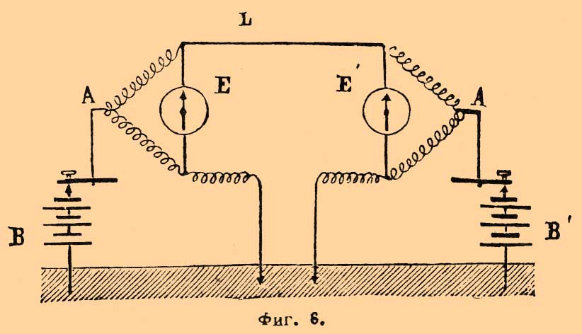 Одна проволока каждого электромагнита соединена с проводом (L), землею и другою станцией; другая же с батареей (В) и землею. Когда на станции I нажатием ключа ток от гальванической батареи будет пущен в обе обмотки электромагнита (Е), то по одной из них он пройдет через реостат (R) в землю, а по другой в линейный провод на станцию II через одну из обмоток приемного прибора и далее уже в землю. Таким образом, первый электромагнит (Е) останется нейтрален, а второй (Е') притянет свой якорь и приведет в действие пишущий снаряд. Положим теперь, что обе станции работают одновременно. Так как на станции I ключом присоединяется к проводам полюс + батареи, а на станции II полюс, то при одновременном замыкании токи суммируются, почему оба электромагнита станут работать. Применение мостика Витстона представляет то преимущество, что при этом нет надобности в особых дифференциальных электромагнитах. Очевидно, что приведение к нулю, т. е. к бездействию, данного элекромагнита, например с помощью двух противоположных токов, может быть достигнуто и при помощи разветвления токов, известного под названием мостика Витстона. Представим себе в самом деле (фиг. 6), что посредством ключа ток из батареи (В) первой станции посылается по линии (L) на вторую станцию. В точки (А) он разветвляется, так что в линию идет только одна его часть, а другая через проводник надлежащего сопротивления в землю.