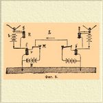 Вместе с нею при помощи системы рычагов (с осями а) перемещается из стороны в сторону небольшой стеклянный сифон (s), одним концом опущенный в чашечку с краской; другой же его конец приходится над движущейся бумажной лентой. Для избежания трения чернил заставляют их постепенно капать на бумагу, электризуя их помощью особой электрической машины. Скорость передачи на подводных линиях при такой системе почти такая же, как и при системе Морзе с воздушными линиями. К подводным линиям можно применить и систему дуплекс, введя в нее некоторые особые приспособления, именно конденсаторы, надлежащим образом устроенные, так как и подводный провод, окруженный гутаперчей и водой (или кабель), представляет также конденсатор.