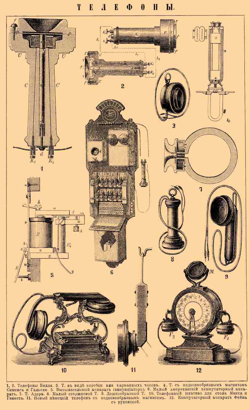 1. Телефон Белля. 2. Телефон Белля. 3. Т. в виде коробки или карманных часов. 4. Т. с подковообразным магнитом Сименса и Гальске. 5. Вызывательный аппарат (аннунциатор). 6. Малый американский коммутаторный аппарат. 7. Т. Адера. 8. Малый стержневой Т. 9. Ложкообразный Т. 10. Телефонный штатив для стола Микса и Генеста. 11. Новый немецкий телефон с подковообразным магнитом. 12. Коммутаторный аппарат Фейна с рукояткой.