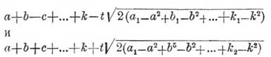 Если а, b, с,...k математические ожидания независимых величин x, y, z,... и, а а 1, b1, c1,...k1 математические ожидания квадратов этих величин, то с вероятностью большей чем 1 —1/t2 можно утверждать, что x+y+ z+...+u принимает значение, лежащее между