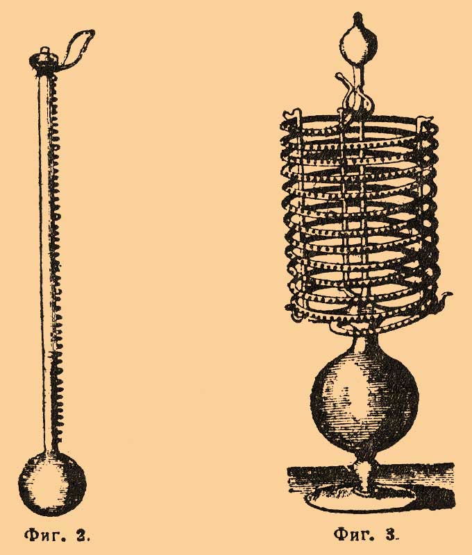 — 1) История T. Изобретателем Т. надо считать Галилея: в его собственных сочинениях нет описания этого прибора, но ученики Галилея, Нелли и Вивиани, свидетельствуют, что уже в 1597 г. он устроил нечто вроде термобароскопа. Галилей изучал в это время Герона Александрийского, у которого уже описано подобное приспособление, но не для измерения степеней тепла, а для поднятия воды при помощи нагревания. Все другие лица, которым приписывают изобретение Т.: лорд Бакон, Роберт Флудд, Санкториус, Скарпи, Корнелий Дреббель, Порта и Саломон де Каус, писали позднее и частью имели личные сношения с Галилеем. Все эти Т. (фиг. 1) были воздушные и состояли из сосуда с трубкою, содержащего воздух, отделенный от атмосферы столбиком воды; они изменяли свои показания и от изменения температуры, и от изменения атмосферного давления.