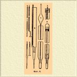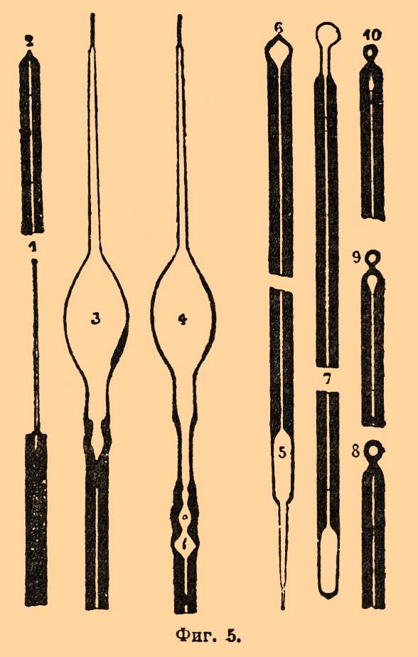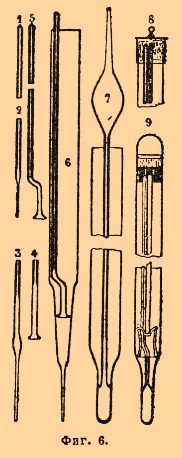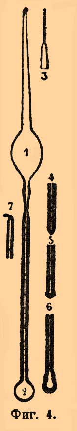 2) Приготовление Т. В настоящее время наибольшим распространением пользуются Т. ртутные: для комнатных Т. ради дешевизны часто берут спирт, подкрашенный раствором средней уксусно-медной соли в аммиаке, для очень низких температур тоже крепкий спирт, а в последнее время нефтяной эфир (уд. в. 0,65) и толуол. Воздушные Т. неудобны и поэтому употребляются лишь редко, при научных исследованиях, для установления точной шкалы температур и как пирометры (см.). Т., основанные на расширении твердых тел, применялись лишь как пирометры и в метеорологии как самозаписывающие приборы (см.) Вильда и Дрепера, но оставлены, вследствие своей изменчивости: с течением времени упругое последействие (см.) в металле производит большие перемщения нуля шкалы. — Для приготовления обыкновенного Т. стеклодув берет особые трубки, приготовляемые на заводе. Внутренность этих трубок должна быть вполне чиста от пыли и всякого рода налета, поэтому лучшие из них на заводе запаивают сейчас по изготовлении. Для научных Т. берут обыкновенно трубки с круглым просветом, а для обыкновенных предпочитают просвет плоский, в виде вытянутого эллипса, хотя трубки такой формы менее правильны, но в них лучше виден столбик; для этого же с задней стороны трубки для Т. часто снабжают полоскою белой эмали. Для медицинских Т., с очень узкою трубкою, ее наружной поверхности придают вид трехгранной призмы с выпуклыми гранями, так что просвет представляется в значительно расширенном виде, как через увеличивающую цилиндрическую линзу, когда на него смотрят в надлежащем направлении. Выбрав трубку, стеклодув запаивает сначала один ее конец (фиг. 4), затем раздувает его в формы рисунка (5, 6), пока не получится шарик (2).