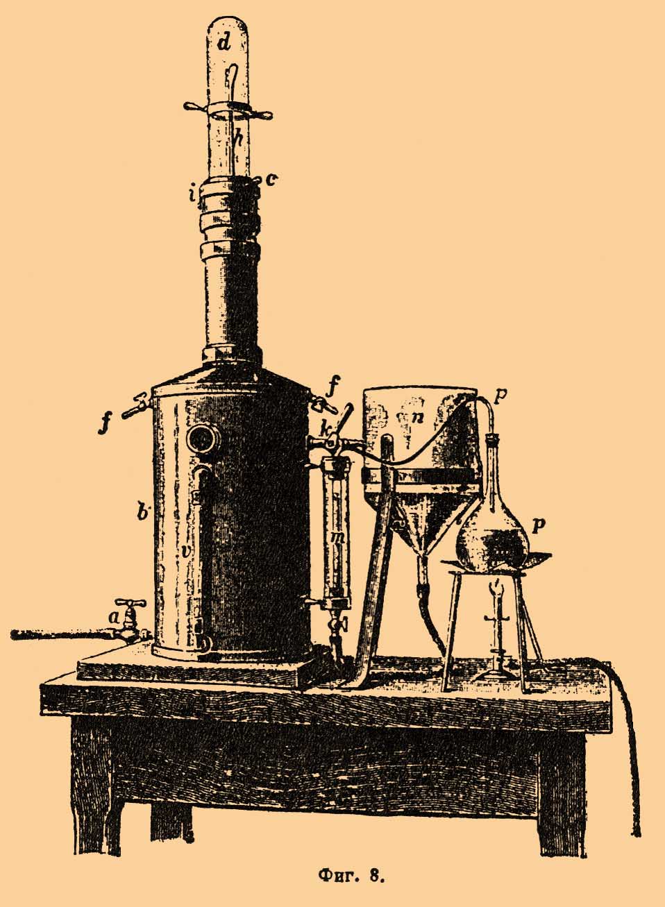 Пар из особого паровичка входит по трубке а во внешнюю оболочку нижней, широкой части прибора, наполненной водою, и заставляет ее кипеть. Вода, налитая во внутренний сосуд, в пары которой погружен Т. h, получает тепло лишь от окружающей ее кипящей воды, и пар ее перегреваться не может: он поднимается по внутренней трубке в стеклянный колпачок d, спускается по наружному, концентрическому пространству и выходит через краны f. Если стекло колпачка и сам Т. хорошо промыты щелочью, вода пристает к ним равным слоем и не мешает правильному отсчету. Водомерная трубка v позволяет судить о количестве воды в приборе, а через оконце, над нею расположенное, можно видеть шарик термометра. Манометр m для точного определения разности давления пара в приборе от атмосферного окружен стеклянной трубкой с водою, поддерживаемою при температуре кипения паром из колбы р; внизу манометр v соединен с широким резервуаром с водою n, а сверху помощью крана k его можно соединять или с прибором, или с атмосферою и отсчитывать разности уровня по делениям, нанесенным на самую трубку. Изменение давления пара на 0,3 мм ртути производит изменение в 0,00367° температуры кипения воды, поэтому для самых точных Т. надо отсчитывать показания манометра ν до 0,4 мм. На основании этих опытов вычисляют для каждого Т. таблицы поправок и, сделав отсчет, выписывают из этих таблиц поправку на калибр, на внутреннее и внешнее давление, на положение основных точек, а взяв сумму этих поправок, находят соответственную истинную температуру ртутного Т., соответствующую температуру газового Т. находят из таблицы. Надо стараться избежать поправки на выдающийся столбик ртути: верхняя часть его будет обыкновенно при комнатной температуре, а в нижней будет происходить постепенный переход температур по неизвестному закону, зависящему от условий каждого опыта. Поэтому все предлагавшиеся поправочные формулы ненадежны, лучше, по предложению Гильома, помещать рядом другой Т., но без шарика, из одной трубки, со столбиком ртути той же приблизительно длины, как в Т., и определять его удлинение непосредственно. Все эти поправки делают лишь для первостепенных Т. Второстепенные Т. просто сравнивают с первостепенным и составляют прямо таблицу поправок, которые надо прибавлять к отсчету, чтобы получить температуру по газовому Т. Второстепенные Т. часто делают "метастатическими", т. е. в соответственных местах шкалы и на верхнем конце приготовляют расширения трубки. Таким способом можно укоротить Т., сохраняя на нем обе постоянные точки, для самостоятельной поверки, если Т. надо употреблять лишь в ограниченных пределах температуры. Расширение наверху позволяет перегнать туда часть ртути и пользоваться остальною при более высоких температурах, сделав предварительно сравнение с нормальным. Это устройство необходимо для калориметрических Т., разделяемых на 0,01 доли градусов, иначе трубка вышла бы слишком длинная: так устроены новейшие Т. Бекмана, предназначенные для термохимических исследований. Ртутный Т. из тугоплавкого иенского стекла 59 III можно употреблять до 550° С, если заключить над ртутью азот при давлении около 5 атмосфер: температура кипения ртути под давлением повышается достаточно. Обыкновенно для этой цели делают на верхнем конце расширение такою объема, чтобы газ, впущенный при комнатной темпе