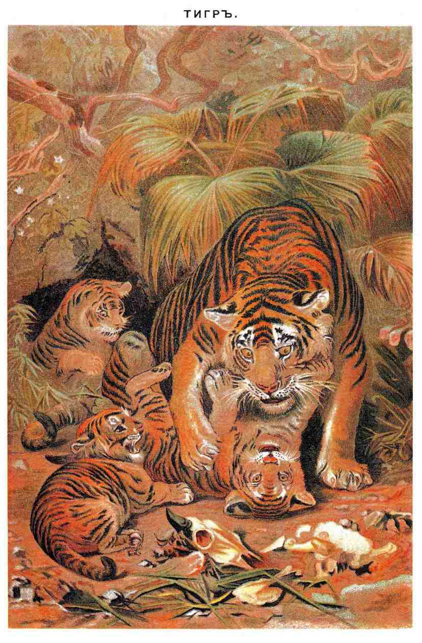 (Felis tigris, см. фиг. 1, табл. II к ст. Кошки и прилаг. табл.) — связан тесным родством со львом (см.) и отличается от него главн. образ. внешними признаками. Существуют и незначительные различия в форме черепа, в относительной длине носовых костей и восходящих отростков верхнечелюстных и в размерах нижних зубов. Т. не имеет гривы, но у старых самцов удлиненная на щеках шерсть образует нечто вроде бакенбард. Цвет меха на верхней и наружной стороне головы, туловища и конечностей, а также и на хвосте более или менее яркий ржаво-желтый с поперечными темными, почти черными полосами, рисунок которых очень разнообразен и иногда неодинаков на обеих сторонах тела. Полосы обыкновенно простые и редко разветвляются. Основной цвет несколько темнее на спине и светлее на боках. На нижней стороне туловища и внутренней стороне конечностей, на щеках и над глазами шерсть почти белая. Вообще, в более теплых странах у Т. шерсть более короткая и прилегающая, окрашена ярче, и рисунок ее резче, в менее теплых она длиннее, мягче и более светлого оттенка. Молодые животные окрашены так же, как взрослые, только несколько светлее. Размеры тела подвержены значительным колебаниям. Наиболее крупный, бенгальский, или королевский, Т. превосходит в этом отношении льва. По одним данным, средняя длина взрослого самца от носа до корня хвоста колеблется от 5 1/2 — 6 1/2 англ. фт., длина хвоста 3 фт.; общая длина тела, если мерить, следуя изгибам головы, шеи и спины, 9—10 фт., но некоторые экземпляры достигают 12. По другим измерениям, средняя длина самца 260—300 стм, из которых 80—95 стм приходится на хвост. Общая длина тела самки на 30—40 стм меньше; голова ее уже и легче сложена. Высота тела в плечах 90—106 стм. Вес самца 163,3—172,4 кило; самки — 108,8—158,7 кило. Т. Явы и Суматры меньше индийского, но сравнительно сильнее; рисунок его меха отличается узкими и более частыми полосами.