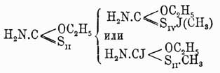 Строение обоих рядов эфиров основано на реакциях их распадения при нагревании со спиртовым аммиаком. При этом эфиры первой формы распадаются на мочевину и меркаптаны, напр.: NH 2—CO—S—CH3 + NH3 = (NH2)2CO + CH3 —SH, a их изомеры — на роданистый аммоний и спирты: NH 2—CS—O—CH3 + NH3 = NH4CNS + CH3 —OH. Wheeler и Bayard Barnes описали случаи перехода эфиров первой формы в их изомеры. Ход реакции, которая имеет место при действии галоидалкилов на эфиры, может быть представлен следующей схемой: