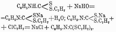 Строение полученного соединения доказывается распадением его на бензилмеркаптан и анилин.