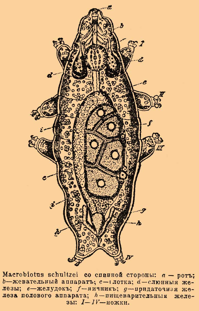 Macrobiotus schultzei со спинной стороны: а — рот; b — жевательный аппарат, с — глотка; d — слюнные железы; е — желудок; f — яичник; g — придаточная железа полового аппарата; h — пищеварительные железы; I—IV — ножки.
