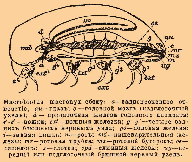 Macr obiotus mасrоnух сбоку; a — заднепроходное отверстие, au — глаз; с — головной мозг (надглоточный узел), d — придаточная железа головного аппарата; e' — e' — ножки, ext — ножные железки; g' — g" — четыре задних брюшных нервных узла; gо — половая железа; i — задняя кишка; т — рот; md — пищеварительные железы; mr — ротовая трубка; ms — ротовой бугорок; ое — пищевод; z — глотка; spd — слюнные железы, ug — передний, или подглоточный, брюшной нервный узел.