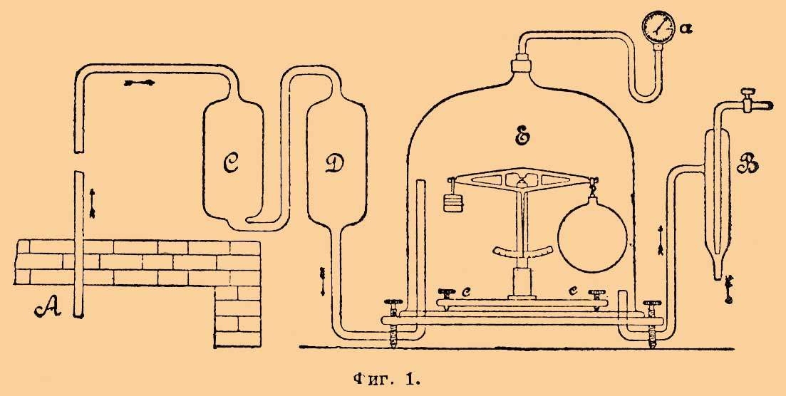 Поэтому в заводской практике об экономическом пользовании данным топливом и данною печью (т. е. об наиболее соответственном отношении между количеством сгорающего воздуха и притекающего топлива) можно просто и прямо судить по изменению плотности сухого и охлажденного дыма; если, например, при той же засыпи топлива уменьшение поддувала или вообще отверстия (заслонки, задвижки, клапана), определяющего приток воздуха, ведет к тому, что дым становится тяжелее, утилизация топлива увеличивается, если же охлажденный дым становится тогда легче, — необходимо увеличить доступ воздуха, чтобы достичь более полного сожигания. Приборы, служащие для удобного (наглядного) определения изменения плотности дыма, получили название дазиметров или эконометров. Так как плотность углекислого газа (22, если H = 1) примерно в 1 1/2 раза более плотности воздуха (14,4), азота (14) и кислорода (16), то, по мере улучшения горения и возрастания в дыме содержания углекислого газа, плотность охлажденного дыма (при постоянной, напр., комнатной, температуре) возрастает, и по ней можно судить о % СО 2 и об изменениях в процессе горения в очаге. Если представим, что большой и легкий шар взвешивается в атмосфере охлажденного дыма, то кажущийся вес шара, равный его истинному весу без веса вытесненного объема атмосферы, будет убывать по мере прибыли СО 2 в дыме. На этом начале и устроены довольно уже разнообразные дазиметры и эконометры, помещаемые около самой топки и определяющие плотность охлажденного дыма во время самого хода горения. Для этой цели из дымохода А водяным насосом непрерывно вытягивается некоторая часть дыма. Проходя через цилиндры С и D, наполненные ватой и помещенные в сосуд с водою, имеющею обыкн. температуру, дым оставляет в них частицы сажи и главную часть воды и входит под стеклянный колокол или шкаф E, в котором находятся весы, назначенные для определения плотности дыма, а именно объемного процента углекислого газа, так что и деления шкалы весов прямо наносятся пропорционально объемному проценту углекислого газа, а нуль шкалы отвечает положению равновесия в воздухе [Чтобы показать явное изменение в плотности дыма по мере увеличения содержания СО 2, достаточно указать на то, что если объем взвешиваемого шара = = 500 куб. см, и при давлении 760 мм температура пространства = 20° С, то в чистом воздухе потеря веса будет около 602 миллиграммов, а в воздухе, содержащем 10 % СО 2 по объему, около 633 мг, т. е. на каждый % вес сосуда будет изменяться примерно на 3 миллиграмма, а такое изменение веса может быть отлично и ясно видимо при надлежащей чувствительности правильно устроенных весов, которые могут прямо по деленной шкале показать объемный % углекислоты. Эконометры представляют по существу такое же устройство, как и дазиметры, только определяется не потеря веса пустотелого шара, а вес газа, вмещающегося в опрокинутый цилиндр, подвешенный на весах и снабженный трубкою, через которую входит и постоянно возобновляется дымовой газ. Считаю нелишним заметить, что показания подобных приборов по многим причинам не могут отличаться очень большою точностью, но не в ней здесь и дело, а относительную прибыль или убыль в дыме СО 2 они показывают с ясностью, что и дает возможность рационально улучшать топки.]. Ссылаясь на указанное выше описание специального устройства разнообразнейши